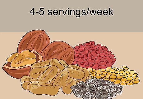 Eat 4 to 5 servings of nuts, seeds, and legumes each week. On the DASH diet, you will eat a variety of legumes, seeds, and nuts each week. Keep in mind that these guidelines are per week, as opposed to daily. Nuts, seeds, and legumes are rich in energy, protein, and fiber. They also contribute magnesium and potassium to your diet. A serving is 1/3 cup of nuts, 2 tablespoons of nut butter, 2 tablespoons of seeds, or ½ cup cooked legumes. Good choices include peanuts, walnuts, sunflower seeds, lentils, and kidney beans.