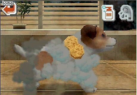 Bathe your dog. It's important that you use the correct shampoo. If your dog has short hair, tap the short hair shampoo to use it. However, if your dog has long hair, use the long hair shampoo. Note that using the correct shampoo and giving them a bath will increase their happiness.