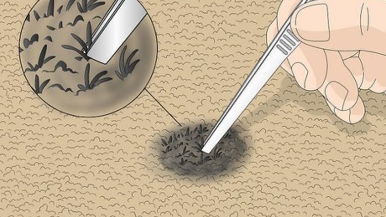 Cut some fibers from another area if a mark is still noticeable. Use a sharp pair of scissors or a razor to snip off some fibers from an inconspicuous area of carpet, such as inside a closet or along a wall. Try to cut the fibers to about the same length as the burnt pieces you just snipped off.