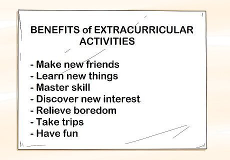 Recognize the benefits of extracurricular activities. Participating in extracurricular activities, and taking leadership roles in them, is something colleges look for and often expect. It can make the difference between being accepted to a school and not. It also increases your chances of getting scholarships and internships. Being involved in them is also attractive to prospective employers. It shows both that you’re responsible and well-rounded. You also make new friends, learn new things, master skills, get the chance to compete, discover new interests, relieve boredom, take trips, and have a lot of fun.