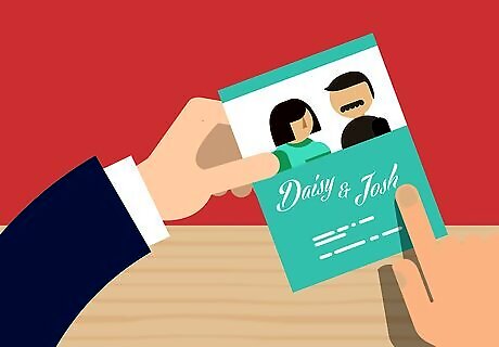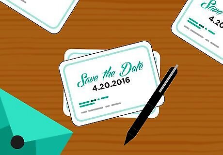 Send guests save the date cards. Six to eight months before your actual wedding, and before you send formal invitations, send your guests “save the date” cards for your wedding. This will allow guests to schedule time and save money for travel and gifts if need be. Your save the date card doesn’t have to be formal as the invitation. It should just let people know the date and location of your wedding. If you have engagement photos or simply a picture of you and your fiancé(e) that you like, you can use this on the card. Send save the date only to the people who you want to attend. Even if some people already know and have said they will come, make sure to send them save the date cards as well.