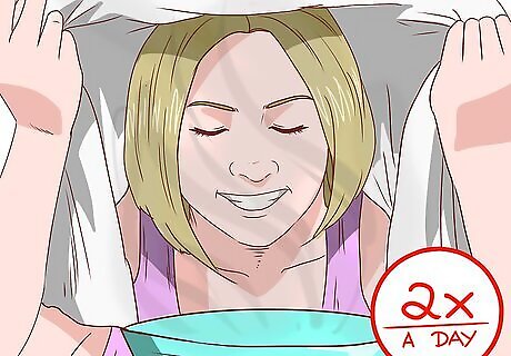 Cover your head with a large, clean cotton towel. Place your face over the steaming pot. Close your eyes. Keep your face at least 12 inches from the water. The steam will dilate your blood vessels and open up your pores, but getting too close to the hot water could damage or even burn your skin.