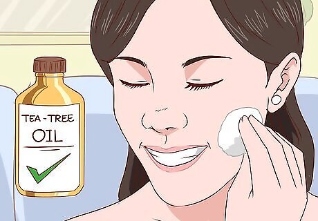 Apply tea tree oil. Use a product containing 5% tea tree oil. Saturate a cotton ball with the oil and dab it on your acne once a day for three months. Tea tree oil takes a little longer to work than benzoyl peroxide, a commonly used topical treatment for acne, but it also has fewer side effects such as dryness, itching, or irritation. Do not ingest tea tree oil, as it is toxic when consumed. If you have eczema, rosacea, or another skin condition, tea tree oil may further irritate your skin. Consult with a dermatologist before using it. For slightly faster results, apply tea tree oil to your skin twice a day, for 20 minutes each time. Wash off with a gentle cleanser such as Cetaphil. Follow this treatment schedule for 45 days.