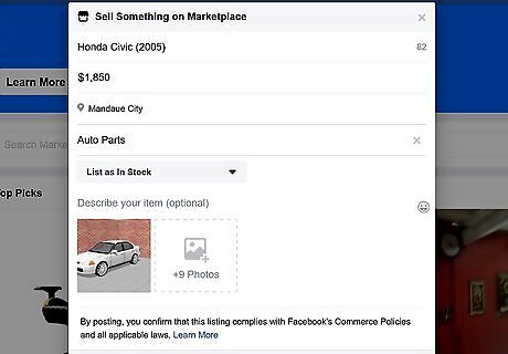 List the vehicle yourself to make the most money possible. You’re more likely to get a high return if you sell the vehicle yourself, but it requires more time and effort. Wash the vehicle and clean the interior. Take some high-quality photos of your vehicle from multiple angles, and list the vehicle information online in a for sale ad.Tip: Be upfront about anything wrong with the vehicle. If you try to hide things that are wrong with the vehicle, you could be sued or run into arguments with the buyer. Put “sold as-is” in the advertisement you write to avoid headaches in the future if the buyer isn’t happy. You can list your ad on Craigslist, Facebook Marketplace, Autotrader, CarGurus, and eBay Motors. These are the most popular sites for a selling a car privately. If the vehicle needs some minor repairs, get it fixed before listing it. You’ll lose a lot negotiating power if there are minor issues with your vehicle. While you’re waiting for replies to your ad, park your vehicle in front of your house and leave a “For Sale” sign in the window with your phone number. You may get calls from folks driving or walking past your vehicle. If the car is expensive, it may be more difficult to sell to a private party.