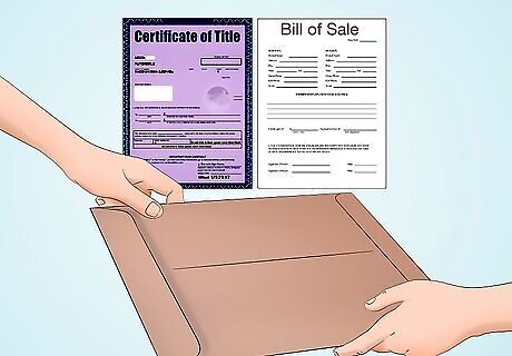 Transfer your title and sign a bill of sale to get rid of the car. The laws surrounding car transfers are different in every state, so look your local laws up first. Generally speaking, you and the buyer sign the title to transfer it, you fill out a transfer form, and you and the buyer sign a release-of-liability form to give the vehicle over. Get a bill of sale and have the buyer sign it to put the sale in writing. You may also need to print and fill out an odometer disclosure to document how many miles are on the vehicle. Depending on where you live, you may need to go to the DMV with the buyer to fill out the transfer form in person. In most states, the license plates stay on the vehicle. If your state requires new plates, go to the DMV with the buyer to get a new set of plates and keep your old ones. Do not accept cashier’s checks from a private buyer. There are lots of scams surrounding cashier’s checks. Take cash if you can. If not, go to the bank with the buyer and cash their check in person.