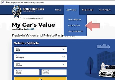 Look up the Blue Book value to determine what your vehicle is worth. Pull up Kelley Blue Book online. Find the pricing tool and enter your vehicle’s year, make, model, and miles. Enter as much optional information as you can to get the most accurate result possible. Kelly Blue Book will list the approximate values for trade and used sale by owner. If you sell the car yourself, expect to make 80-100% of the Blue Book value. If you trade the vehicle in to a dealership, expect to get 60-80% of the value back in credit, depending on the condition of the vehicle. If you sell the vehicle to a company online, expect to earn 30-60% of the Blue Book value back. This isn’t a great return, but selling to an online company is much faster than the other options available.