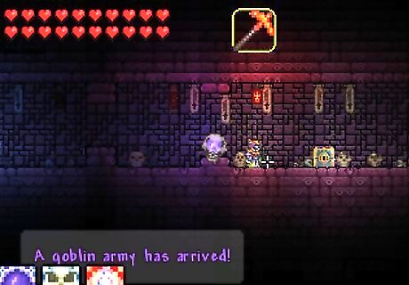 Wait for the Goblin Army event. Each day after the aforementioned step, the Goblin Army has a small chance of occurring. The event isn't very hard to beat, but do this before it happens: When the Goblin Army attacks, lead them away from your house and NPCs. Although they aren't as dangerous as other armies, such as Lunar, Pumpkin Moon, or Pirate Armies, they still can spawn in your house, destroying things and killing NPCs. Prepare potions and weapons. As most Goblins in the Goblin Army use swords and other melee weapons, use ranged weapons to combat them. E.g., bows, guns, blowguns, etc.