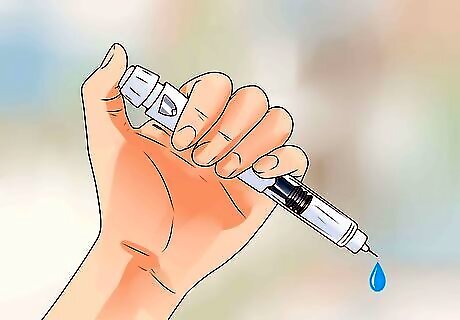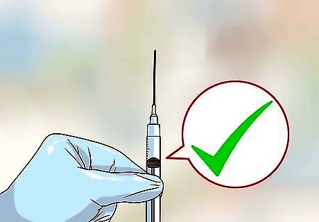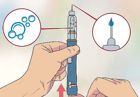 Remove the air from the syringe by pushing the plunger. Remove the needle's cover and set it aside. Turn the syringe so that the needle is pointing up. As you do this, you should see a bubble rise to the top. Use your other hand to push the plunger. Slowly push the plunger until you see 1 to 2 drops of liquid come out of the needle. You can also tap the side of the syringe gently to make the bubble rise to the top before you push it out. After doing this, check to make sure you still have the right dosage in the syringe.