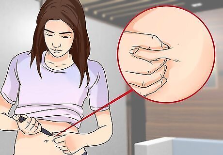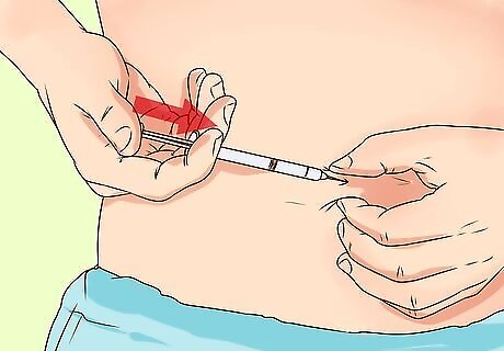 Insert the needle into your skin. Use the finger and thumb of your free hand to squeeze a bit of skin, about 1 inch (2.5 cm) in length, around the injection site. Using a quick, smooth motion, insert the needle into the injection site at a 90° angle. Once the needle is inserted, let go of your skin. Then gently pull the plunger back with your free hand. If you are giving someone else the injection, do so on the count of 3. It is not unusual to see blood during the injection. If you see blood in the plunger, this means you entered a blood vessel. Stop pulling the plunger and slowly remove the needle at a 45° angle. Place it in the sharps container and use a new syringe.