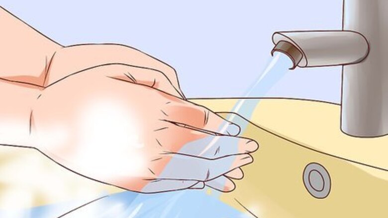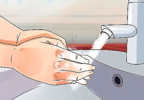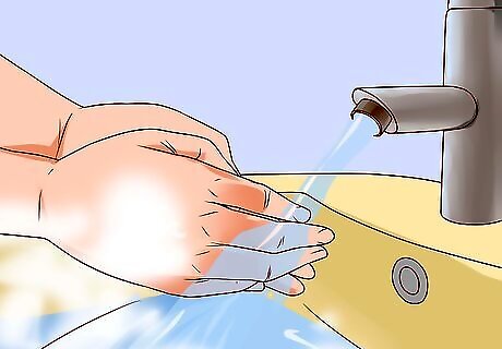 Clean your hands. Turn on the faucet and place your hands under the cold running water. Place a small amount of soap in your hand. Rub your hands together until a thick lather forms, about 20 seconds. Rinse your hands until all of the soap is removed. Turn off the faucet and dry your hands with a clean paper towel.