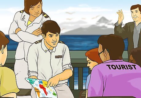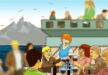 Secure accommodations for your travel party. Reserve a room for yourself and everyone who will be accompanying you on the trip. Expedition cruise ships tend to be much smaller and less extravagant than luxury liners, sometimes housing as few as 60 passengers plus crew. Most cabins contain one or two beds and a minimal washroom, and feature a single large lounge area, so pack light. Booking your tickets guarantees you a room aboard the ship, as well as meals in the dining room and activities. Because of the modest size and limited arrangements of expedition cruise ships, this type of outing may not be the best for large families or people who prefer to travel in large groups.