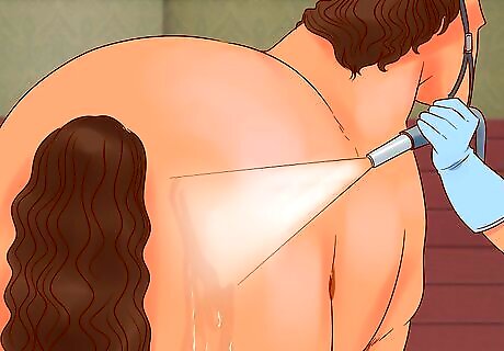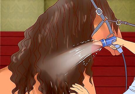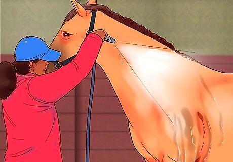 Rinse all the shampoo off your horse. Run a hose over the entire body, muzzle, and rear of the horse. Work the shampoo out with your hands until there are no more suds left and the horse's hair looks smooth. Leaving shampoo on your horse’s hair could irritate it later.