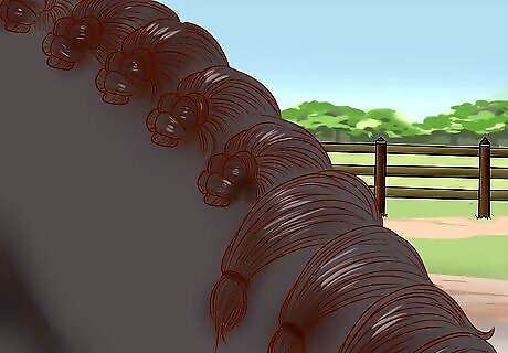Braid your horse’s mane for a unique look. Make sure to read the rules of the competition you’re entering to make sure that braiding your horse’s mane is allowed. To braid their mane, tie it into small, 1 in (2.5 cm) ponytails and use an elastic bands to secure them. Separate each ponytail into 3 parts and wrap the side parts around the middle part to make a simple braid. You can also use more complex braids like a French or Dutch braid to really wow the judges. You can dampen the mane if you’re having trouble putting it into braids.