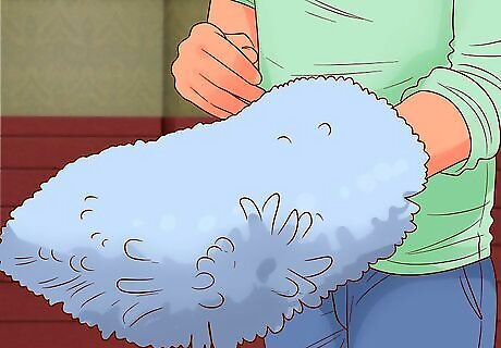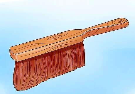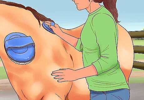 Use a soft brush to brush the entire horse. A soft bristled brush has softer bristles that won’t irritate your horse’s face. Start on the face of the horse then work your way down its neck and shoulders. Continue to run the brush over the horse’s body in small strokes to remove finer pieces of dirt and dust.