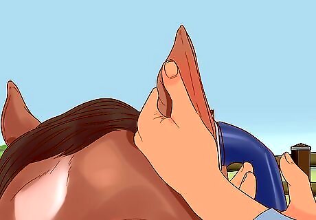 Trim the hair around the horse’s ears. Use size 10 clippers for the ears. Run the clippers from the tip to the base of the ear in a downward motion. Cut around the outside of the ears and aim to get the hair an even length. This will give the ears a sleek and neat look. Long and wispy ear hairs could make your horse look messy.