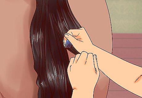 Comb out any knots in your horse’s tail with a wide-toothed comb. Hold the hair away from the base of the tail with one hand and comb out the knots with the other hand. This will prevent you from ripping out the hair from the root and hurting your horse. Comb out the sections closest to the roots and work your way down the tail. Continue combing the tail with the comb until there aren’t any knots in it. You can spray some conditioner in the horse’s tail to make it easier to comb.