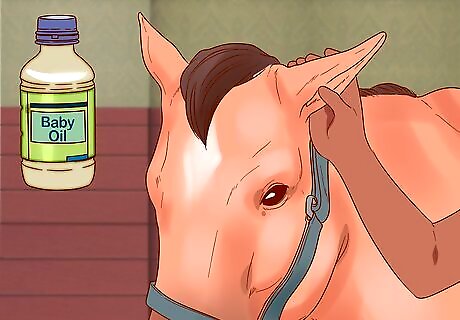 Rub baby oil on the horse’s muzzle and ears. Pour a couple of drops of baby oil into a rag. Take the rag and rub the outside of the horse’s ears and on the side and front of the horse’s nose or muzzle. Get the ears and muzzle saturated with the oil until they are shiny. This will make the horse's groomed face stand out more.