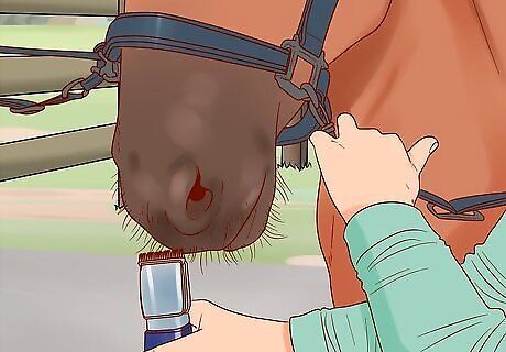 Shave the horse’s muzzle with size 10 clippers. Slide the size 10 attachment onto the blades of the clippers. Turn the clippers on and let it run for a few minutes so your horse can get used to the noise. Once the horse seems calm, rub the clippers in an upward motion on the horse’s nose to trim the whiskers. Once you're done with the whiskers, trim the hair on the jawline and under the horse’s face, making sure to cut away any wispy hairs. The hair on the horse's face should be an even length all around. Finally, shave the side of the horse’s face to finish trimming its muzzle. The clippers should not hurt the horse. Clipping the horse’s whiskers is sometimes suggested or required in horse shows.