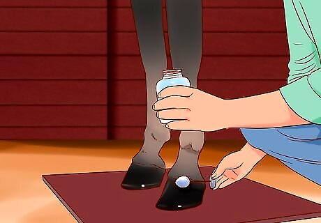 Polish the horse’s hooves. Purchase a black hoof polish online or at a horse accessory store. Lay down a piece of cardboard or sheet so you don’t get polish on the ground. Dab a rag or brush in the polish to saturate it. Then, run the brush or rag in a straight line around the top edge of the hoof where the hoof and leg meet. Fill in the rest of the hoof so it has a solid black color. When you're done, let the hooves dry off for a few minutes so that the polish doesn't rub off.
