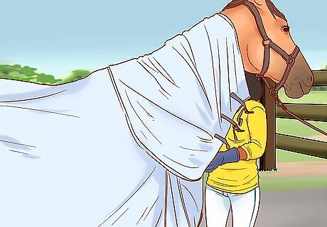 Cover your horse to keep it clean until the show. A horse blanket will cover the horse's body and a tail bag will keep the horse's tail clean and free of dirt until the day of the show. Wrap the blanket around the horse and secure it by the fasteners so that it stays in place. Then, put the horse's tail in the tail bag and carefully tighten the top of the bag. To keep the horse's legs clean, wrap them in stockings or standing wraps. You can buy a horse blanket, tail bag, and standing wraps online or at an equestrian accessory store.