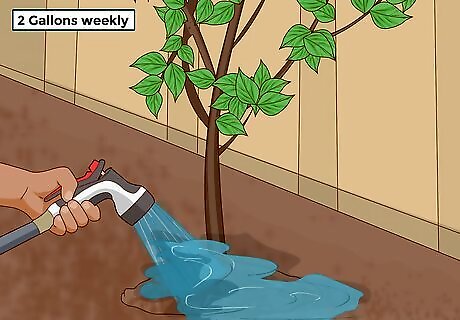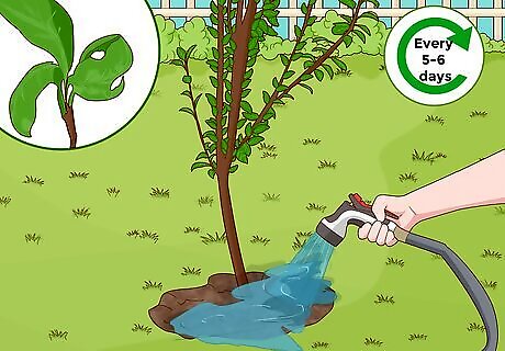 Water your new tree weekly for the first year. Newly planted trees need plenty of water for the first few weeks after planting. Water your tree deeply so the water soaks about 8 inches (20 cm) into your soil. Letting a tree get too dry can affect its growth and production of fruit. On the other hand, overwatering can damage the roots.