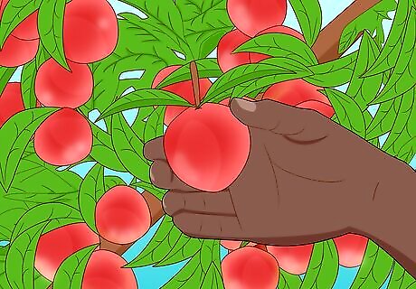Harvest ripe plums when they feel soft and detach from the tree easily. If you pick plums early, put them in a clean paper bag with the top folded over and let them sit at room temperature for a day or two. Your plum is ripe when your fingertip makes a small dent, but doesn’t puncture the skin. European plums can be picked when they’re fully ripened. You can pick Japanese and American Hybrid plums slightly early and ripen them. Use your plums to make dishes like grilled plums or plum jam.
