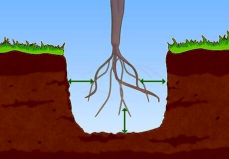 Dig a hole slightly deeper and wider than the tallest, longest roots. Try not to bend the roots so they can spread and grow. Your tree's roots will grow outward. Make sure its longest roots have room to grow and form a stable base for your tree.