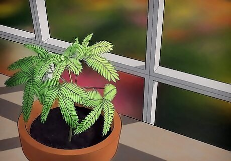 Provide plenty of sunlight. If sensitive plants do not get enough sun, they may close their leaves. Put them in a location where they receive full sun for most of the day, or partial shade if you live in a very hot region. In ideal conditions with temperatures around 70ºF (21ºC), the seeds may germinate in under a week. In less ideal conditions, or if you didn't soak the seeds, this may take two to four weeks. Some of your seeds may survive colder nighttime temperatures, but they may end up slow-growing or fragile. Never expose the seeds to frost. If the room is too cool or too dry, cover the pot with plastic wrap to trap heat and moisture. Remove this as soon as the first seedling appears.