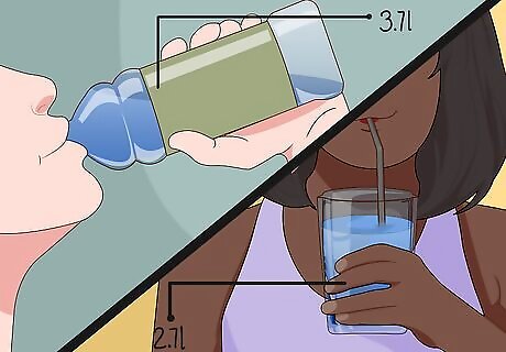 Drink enough water to keep your hair hydrated. Your hair needs hydration from within, just like your skin, and your edges are no exception. If you're a woman, drink 11.5 cups (2.7 L) of water per day, while if you're a guy, aim for 15.5 cups (3.7 L) a day. If you have trouble getting your water in, try hydration apps that remind you to drink or set up a bottle with the amount you need to drink in a day. You could also try flavoring your water. Add slices of fruits or veggies like strawberries, oranges, cucumbers, or watermelon. You could also try herbs, such as mint or basil.