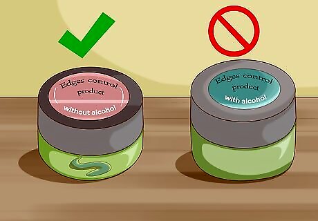 Choose edge-control products without alcohol. Slicking back your edges with a product can put extra tension on your edges. Plus, most strong-holding products have alcohol. Opt for edge-control products without alcohol. If you must pick one with alcohol, go for one that has fatty alcohols, such as cetyl alcohol and stearyl alcohol. Another option is to add a moisturizing gel to the edges with your fingers. Then cover the area with a scarf for half an hour or so to smooth it out Alcohol dries fast, which allows the product to dry fast. However, it can also dry out your hair, leading to more damage. Avoid ones that say "Max hold" or "Super hold." Always rinse it out or break it up before going to bed.