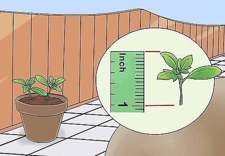 Expose the seedlings to the outdoors once they have at least 2 pairs of leaves. At this point, the seedlings should be at least 1 inch (2.5 cm) tall. Once you see at least 2 pairs of healthy leaves that have grown, you can begin to help the young plants adjust to the outdoors. Avoid placing the pot in direct sunlight when they're first placed outside, and protect them from any wind. Leave the plants outside in their original pot for about a week, monitoring them to make sure they're hydrated and healthy. If the weather is supposed to turn cold overnight, bring the seedlings inside and place them back outside in the morning. You're transferring them when winter is over, so the days should be warm.