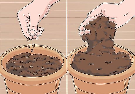 Sprinkle the seeds into the container before covering them with soil. Take the seeds out of the paper towel and gently drop them into the soil, trying to get them as evenly spaced as possible. Spread a fine layer of soil over the seeds to ensure they're covered. If you're using a seed tray, try to put 2-3 seeds in each section. If the pot is a bit larger, you can sprinkle 5-7 seeds. You don’t need to measure out where each seed goes, just try to spread them in each area of the container. The layer of soil shouldn’t be thick, you just want to make sure the seeds aren’t exposed—a thickness of 1 centimetre (0.39 in) should work fine. Use the same nutrient-rich soil that you used in the container.