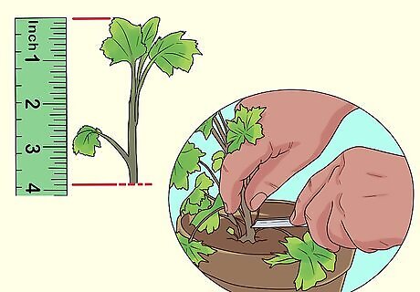 Make the cut near the crown of the plant. The crown of the plant is the spot where the stems join the root. Use a sharp knife to cut the shoot off, making sure the cut is about 10 centimetres (3.9 in) long. If there are leaves near the bottom of the shoot, strip these away so that the bottom of the stem is clear. Make your cut above the actual root of the plant.