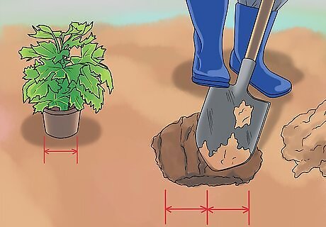 Dig a hole that’s twice the size of the plant’s container. Once you’ve prepared your soil, use a shovel to dig a hole big enough for your plant’s root ball to fit in, while also giving the roots lots of room to expand. While the width should be twice the size of the plant’s container, the depth should be just deep enough so that the plant is at the same level that it was in the container—you don’t want the leaves to be covered in soil.