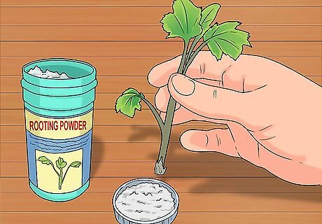 Dip the cutting in a hormone rooting powder. The powder will prevent the roots from rotting and will help them grow to be a healthy, strong plant. You can find hormone rooting powder at a garden store or online. While it's not always necessary, you can wet the end of the stem before dipping it in the hormone rooting powder so that more powder sticks to it.