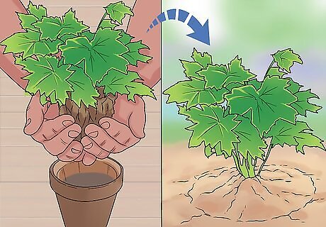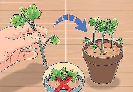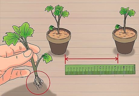 Transplant the cuttings once the roots grow through the drainage holes. This will probably take several weeks, so be patient and stay attentive to the cuttings. Once you see the roots growing through the pot’s drainage holes, it’s time to transfer the cuttings to their own separate pots. The cuttings can be transplanted outdoors once they’ve filled in their own individual pots. Space the cuttings so that the individual plants are roughly 18–24 inches (46–61 cm) apart in the garden. The separate pots don't need to be large—a small or average-sized pot will do. There should be enough room for the roots to grow comfortably.