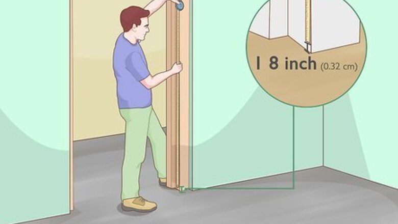 Trim the slab door to fit the doorframe. If your slab door is longer or wider than the old slab door or the measurements for the doorframe opening, trim it down to size. If less than ⁄8 inch (0.32 cm) needs to be trimmed from the bottom and/or sides, plane the door to get it down to size. If you need to trim more than ⁄8 inch (0.32 cm), use a circular saw to trim the door down to the size of your pencil-marked measurements.