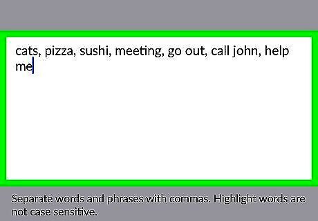 Type words or phrases you want highlighted separated by commas. If it’s only one word or phrase, just type it into the blank (no commas). Otherwise, add a comma and a space after each word or phrase. Here’s an example: cats, pizza, sushi, meeting, go out, call John, help me.