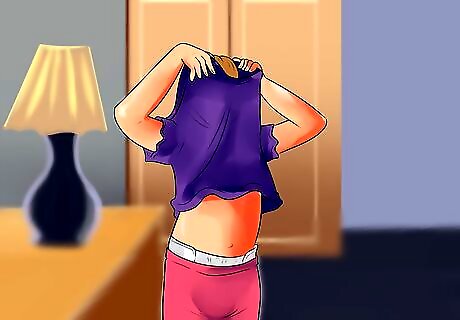 Wear clothing that is at least two or three sizes larger than what you usually wear to bed when you wear your protective clothing. Try to nix all frilly pieces of lingerie when you go to bed, as the frilly clothing will make for a much tighter fit, and with diapers, you want to feel a bit lose on your stomach-line. Use sets of nightwear that include nightshirts and night pants until you no longer need to wear the diapers to bed: these can include sweatpants and casual nightwear, but you'll have to buy the more comfortable pieces.The bigger the clothing, the better the possibility the protective clothing will not be seen or noticed easily. If you own an adult blanket sleeper, you may choose to wear it, though you may want to think twice about the current weather conditions since these sleepers are always a bit baggy in the genital areas the diaper will be utilized.