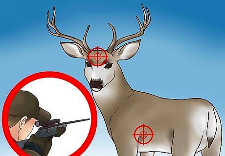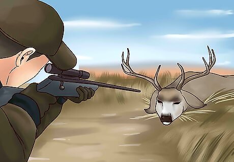 Take your best shot. The phrase “you only get one shot” is quite often true when hunting mule deer. Miss your mark, and you will probably lose your prize (or, even worse, lose it and cause it a slow, painful death later on). In terms of choosing where to aim, you have several options. Shots into the brain or spinal cord will cause the quickest, most humane death, but are also much more challenging for the typical hunter. Basically, aim for a spot you know you can hit. Brain shots are the target of choice for many professionals, as they cause instant death and preserve all the meat. However, it is very easy to miss completely or, worse, wound the deer in the face or mouth. A properly-placed neck shot will snap the spinal cord and cause quick death, but again, the target area is very small. A miss may paralyze but not kill the deer, or cause a wound that will cause a slow, painful death if the deer escapes. A shot that passes from one shoulder blade through the other will also sever the spinal cord and kill quickly, but is likely to damage some of the meat. Also, once again, the target area is small. Heart-and-lung shots, targeted behind the front leg and slightly up from the chest, are the traditional standby for most hunters. Such shots usually cause significant bleeding, which is beneficial because you will almost certainly have to track and finish off the wounded deer.