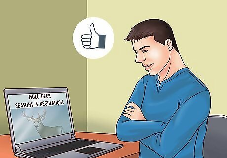 Follow the rules. For your own safety (and to avoid legal troubles), as well as for the benefit of a mule deer population that is in decline, hunt only in season and according to the regulations established by that state, province, or territory. In the U.S., contact the relevant state wildlife agency for information on hunting seasons, licenses, regulations, etc. Website links for seventeen state wildlife agencies in “muley” territory can be found at https://muledeer.org/state-wildlife-agencies/. Familiarize yourself with any restrictions on the size or type of deer that can be taken during that state’s particular season. If you are hunting mule deer bucks, the definition of “antlered” may be as simple as “having an antler fully erupted through the skin and capable of being shed.” Meanwhile, the big prize for serious hunters is a “muley” that is over 200 inches (500 cm) in length and has a antler spread of at least 30 inches (76 cm). Your target buck is likely to be somewhere between these two extremes.