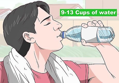 Drink plenty of water. It’s important to drink a lot of water because it helps the liver function more effectively. A person that is dehydrated in minimizing their liver’s ability to filter their system. It is recommended that an adult drink between 9 and 13 cups of water every day, depending on your size and the amount of sweating or activity you are doing.