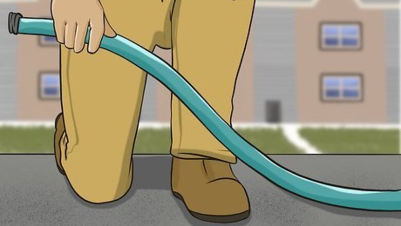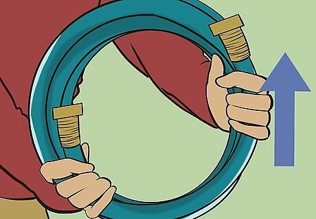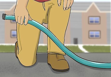 Bring the hose inside your RV to warm it up. Once the hose is completely disconnected from the water supply, hold the ends so they're pointing up or else water could spill out. Drape the hose inside your RV's shower so the water melts and goes into the drain. Turn on the RV's heater and let all of the ice inside the hose melt so the hose is empty. The water from the melted ice will exit the hose and fall into the drain.
