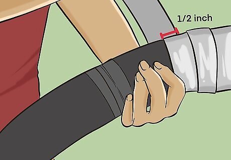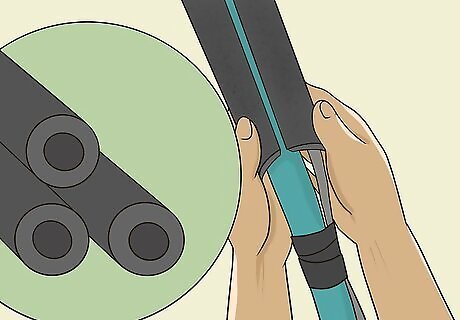 Wrap the outside of the foam with pipe insulation tape. Pipe insulation tape has a foil-like exterior and adheres to itself to prevent heat from escaping. Start wrapping near the end of the hose, overlapping the tape by about ⁄2 inch (1.3 cm) with each coil. Continue wrapping the tape around the foam tubing until you reach the other end of the hose. You can buy insulation tape from your local hardware store. If you don't have insulation tape, you can also wrap aluminum foil around the tubing and duct tape it every 1 foot (30 cm) to hold it in place.