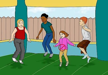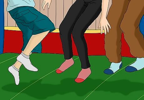 Wear proper socks. Kids jump in bounce houses without shoes on. However, they should wear socks. The socks should have grip or tread on them to help the kids from slipping and falling. Don't let your kid jump in socks with slick bottoms. This might cause an injury.
