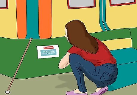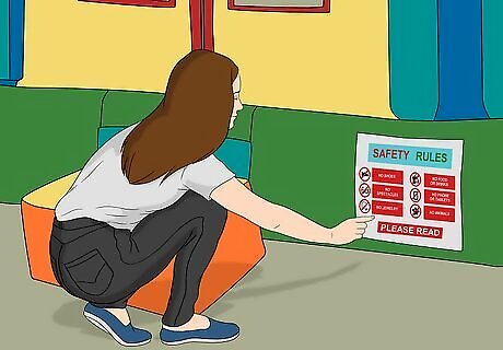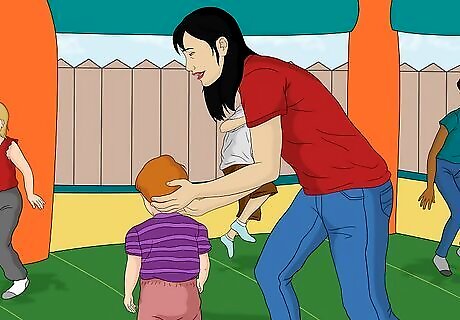 Supervise small children inside the bounce house. If you allow children younger than six to jump in the bounce house, consider assigning an adult or two to supervise the children closely. Young children can easily get hurt by falling or losing their balance inside a bounce house. Consider having an adult inside the bounce house. The adult should be seated and near the children, but not jumping with the children. Parents with young children may want to go inside the bounce house with their kids. The parents should remain seated and on the sidelines, but be near enough to hold their child's hand or watch them to help prevent injury.