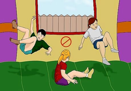 Adhere to maximum occupancy rules. Most bounce houses have a maximum occupancy number. This number usually can be found listed on the outside of the bounce house. Though kids may want to be together all at once, keep the number of bouncers under the maximum occupancy to protect them. Maximum occupancy numbers help keep the bounce house empty enough so kids aren't jumping on top of one another or too closely together, which can lead to injury. Consider only letting in a small number of children at the same time. This allows the children more room to move around and jump, so they not only have more fun, but stay safe. The majority of injuries inside bounce houses occur due to kids either falling inside the bounce house or crashing into other children. This is why watching children is so important, as well as not overcrowding the bounce house.