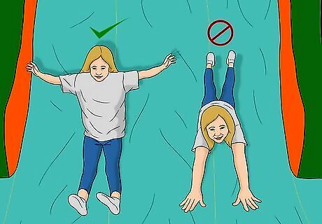 Bounce and slide properly. Bouncing and sliding properly can help reduce the risk of injury. Children should not bounce on their backs. Instead, they should remain on their feet while bouncing. When they fall, they should immediately get back up. When children slide down in a bounce house, they should slide feet first. They should never slide down face first. This can lead to neck or head injuries.