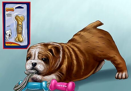 Give your dog its own toys. When your dog is busy with its own toys, it may be less likely to take your kids’ toys. Many types of toys are available for dogs, such as puzzle toys, chew toys, soft plush toys, and nylon bones. You could even turn dirty laundry (pillowcases, t-shirts, towel) into toys, since your dog would enjoy smelling your scent on the item. Interactive toys, such as a rope toys, could also be a good toy type for your dog. Interactive toys would allow you and your dog to spend quality time together. If your dog is particularly destructive, choose toys that are durable, such as nylon bones. Do not choose toys that have easily removable parts, like string or plastic eyes. Your dog could swallow these parts, causing a potentially serious medical problem.