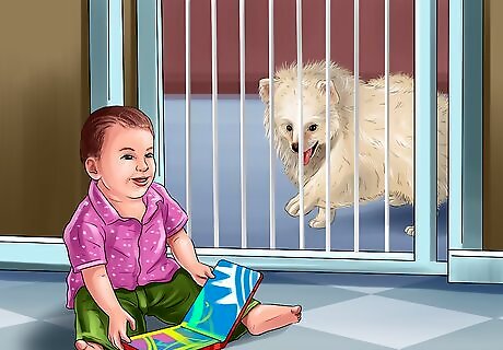 Create separate play areas for your kids and your dog. If your kids play with their toys around your dog, your dog may try to take the toys away from your kids. To prevent this from happening, have your kids play in a separate room from your dog. When your kids are finished playing, have them put up their toys so your dog cannot get to the toys. If your dog and kids are in the same room, consider telling your dog to lie down and stay in an area of the room away from your kids. You could also put up a baby gate to separate your dog from your kids as they play.